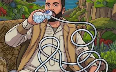 Moim zdaniem mężczyzna pije wodę. Obserwując labirynt rur, zauważymy, że rura połączona z butelką, którą trzyma, prowadzi ostatecznie do kubka…