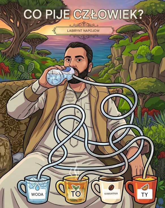 Moim zdaniem mężczyzna pije wodę. Obserwując labirynt rur, zauważymy, że rura połączona z butelką, którą trzyma, prowadzi ostatecznie do kubka z napisem „WODA”. Chociaż rury wydają się bardzo skomplikowane i przecinają się kilkakrotnie, ścieżka prowadzi od butelki i dalej wzdłuż zakrętów do kubka z wodą.