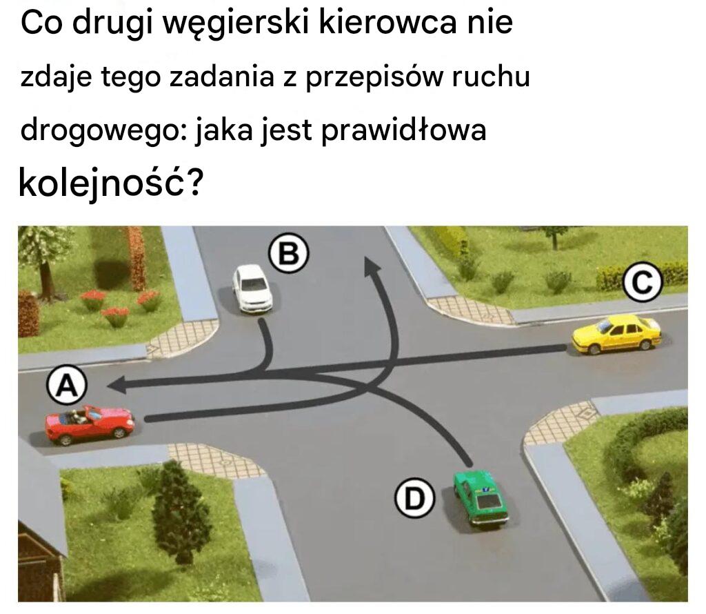 Co drugi węgierski kierowca nie zdaje tego zadania z przepisów ruchu drogowego: jaka jest prawidłowa kolejność?