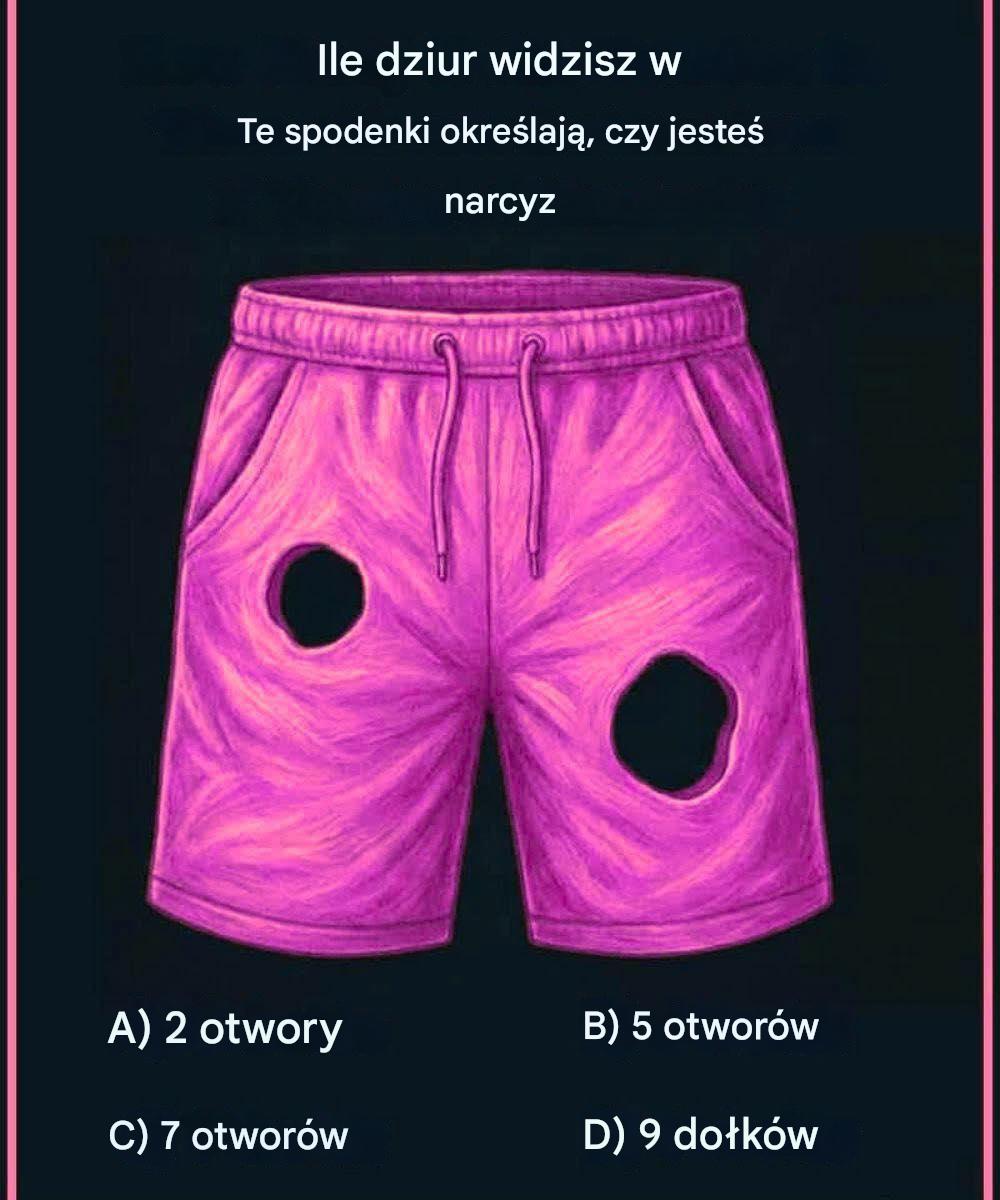 Na pierwszy rzut oka ten viralowy obrazek wygląda jak nic innego jak zniszczone spodenki. Ale gdy tylko przeczytasz nagłówek – „Ile dziur widzisz w tych spodenkach, decyduje o tym, czy jesteś narcyzem” – twój mózg natychmiast przełącza się z biernego przewijania na tryb analityczny. I właśnie dlatego ta optyczna łamigłówka podbiła media społecznościowe: kwestionuje twoją percepcję, jednocześnie drażniąc twoje ego.
