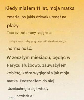 Wyglądała dokładnie jak moja matka. Te same oczy, ten sam sposób, w jaki zaczesywała włosy za ucho. Serce waliło mi jak młotem, gdy za nią podążałem, walcząc między niedowierzaniem a rozpaczliwą nadzieją, której nie potrafiłem wytłumaczyć.