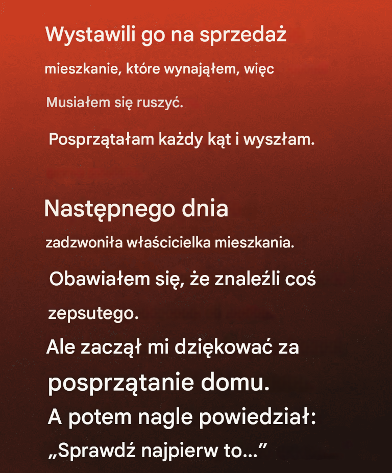 Kiedy małe mieszkanie, które wynajmowałem, zostało wystawione na sprzedaż, wiedziałem, że czas się ruszyć. Spakowałem walizki, rozejrzałem się po okolicy po raz ostatni i spędziłem godziny, czyszcząc każdy kąt, zanim zamknąłem drzwi. Wydawało się, że to idealny sposób na pożegnanie się z miejscem, które gościło tak wiele w moim życiu.