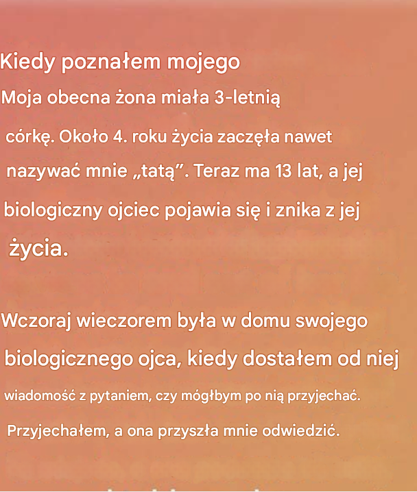 Miał trzy lata, kiedy ją poznała – loki, nieufne spojrzenie i pluszowa żyrafa ściskana jak zbroja. Kiedy cztery lata, sama zaczęła nazywać mnie „tatusiem”, jakby to było moje imię na zawsze. Teraz ma trzynaście lat. Jego biologiczny ojciec pojawia się i znika jak brzydka pogoda. był z nim wczoraj wieczorem, kiedy zaświecił się mój telefon: