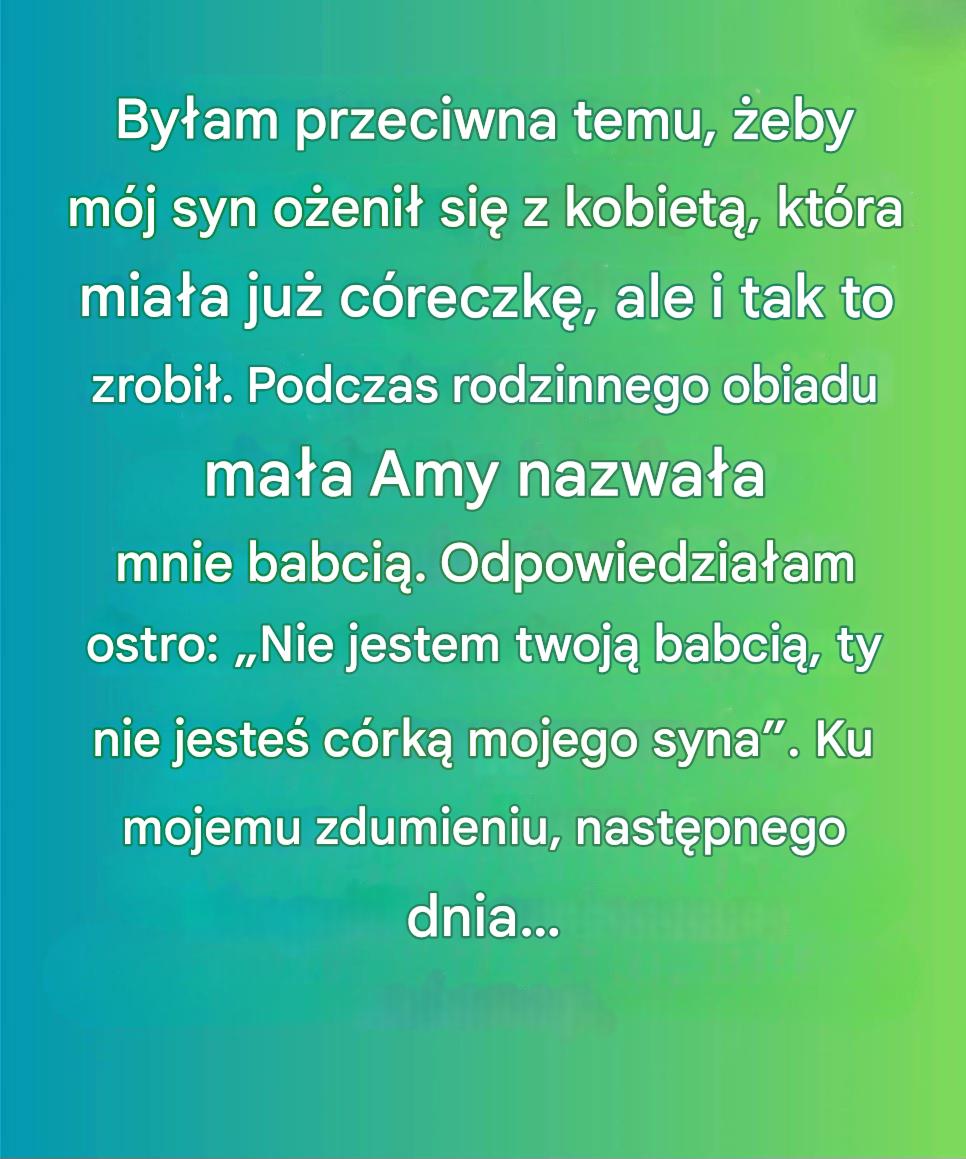 To słowo powinno rozgrzać moje serce, ale coś we mnie drgnęło i wyrzuciłam z siebie, niemal bez namysłu: „Nie jestem twoją babcią”. Zdanie to rozdarło ciszę, jakby coś pękło. W jednej chwili w pokoju zapadła cisza. Uśmiech Amy zbladł – nie dramatycznie, nie głośno, tak jak dziecko zatrzymuje się w pół słowa, gdy zdaje sobie sprawę, że powiedziało coś niewłaściwego.