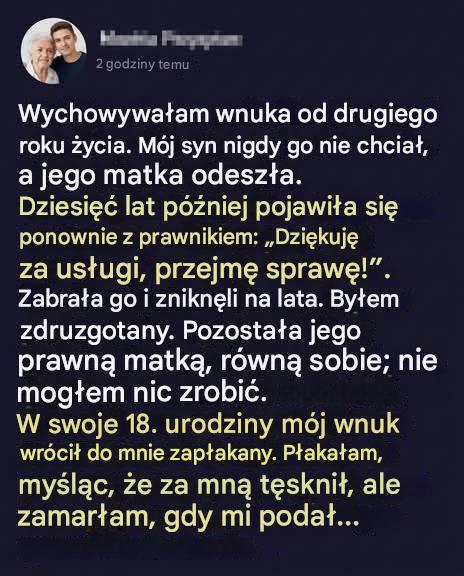 Są więzi, których nic nie jest w stanie całkowicie zerwać, nawet czas, odległość czy decyzje dorosłych. Niektóre historie przypominają nam, że miłość okazywana codziennie pozostawia niezatarty ślad. Moja jest szczególnie bolesna, ponieważ wychowałam wnuka jak własne dziecko… zanim został mi odebrany. Przez lata żyłam w milczeniu i nieobecności, aż do dnia, w którym ktoś zapukał do moich drzwi.